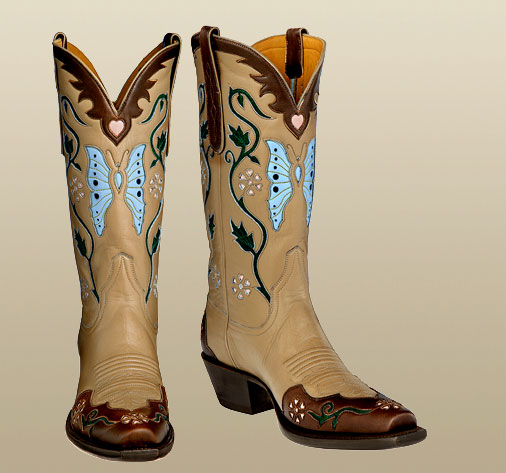 Moroccan Butterflies Golden Tan Calf with Medium Brown wing tip, foxing, collar & pulls. Inlays in Light Blue, Green & Pink. 12” uppers, shallow scallop, C pulls X 5/8 toe & # 5 heel.