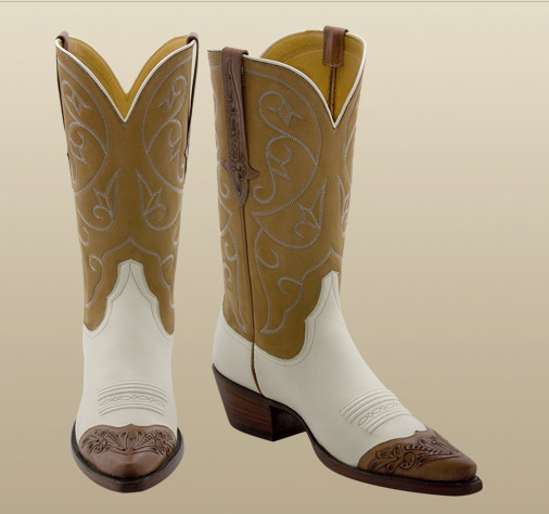 Roxy Costner Off white Kidd vamp with wrinkle, Tan Nubuck 13" upper. Tooled wing tip and pulls, XX toe, #5RL heel.