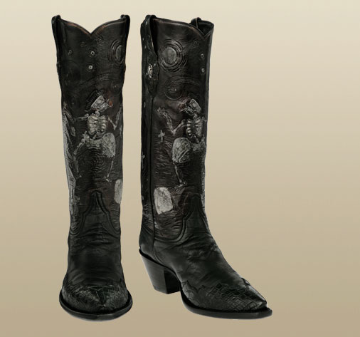 Spanish Dancers Black European Calf with 16” tooled uppers. Crocodile / Gator wing tip & foxing. Tooled pulls with Sterling Silver Skulls. Shallow scallop, X toe & # 8 heel.