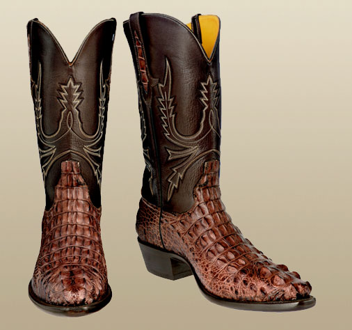 Sport Rust Hornedback Alligator vamp. European calf top, 13” high, regular scallop. 5 row stitch. X toe – 5m heel.
