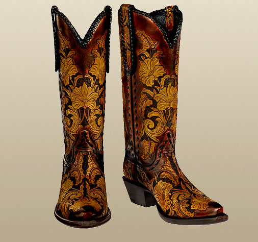 Western Flowers Full tooled calf with braided top edge and pulls. Buck stitch on vamp, counter and sides. 13” tall, regular scallop. X toe – 6L heel.