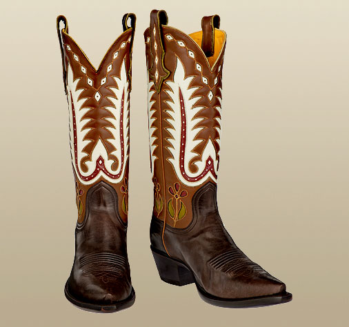 Western Vintage European calf foot with toe bug and wrinkle. Contrasting inlayed calf top. 13” high, regular scallop. X toe – 5m heel.