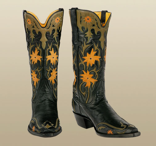 Wild Flowers Black European Calf with Olive Green & Buttercup inlays, collar wing tip & foxing. 13” uppers, round scallop, B pulls X toe & # 5 heel.