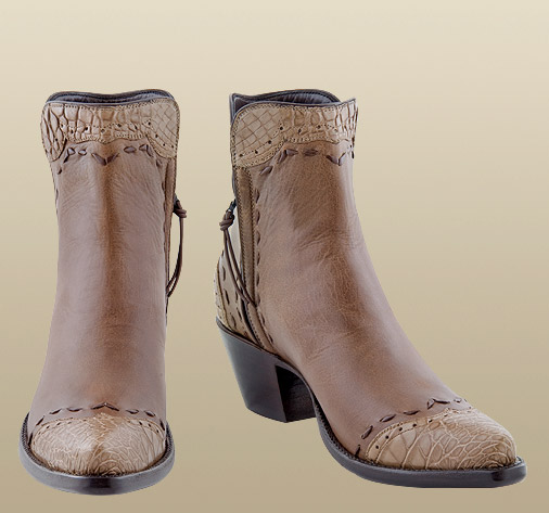 Flamenco Dark Taupe Calf with contrasting Alligator wingtip, foxing and collar. Chocolate buckstitch, fancy scallop, X toe, #6RL heel