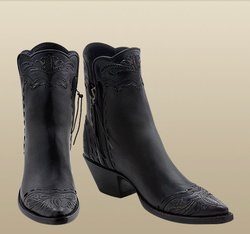 Marcy - Black Black Ranch hand with black antique-tooled wing tip, foxing and collar. Black buckstitch, fancy scallop, X toe, #6RL heel.