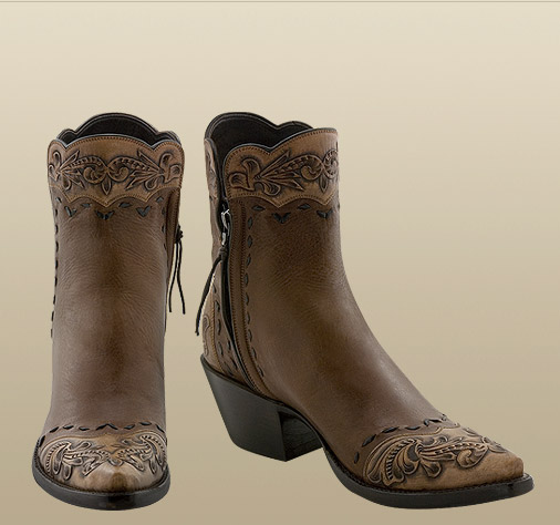 Trudy Medium Brown Ranch hand. Tooled wing tip, foxing and collar. Chocolate buckstitch, fancy scallop, X toe, #6L heel.